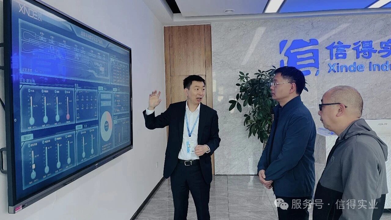 在信得董事长秦灿先生的陪同下,罗巍主任一行走进数字化生产车间,通过数字化车间管理系统的实时运行数据,直观了解公司数字化转型进程及当前生产运营状况。